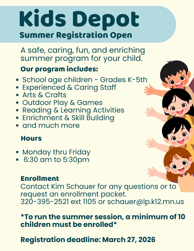 Lester Prairie Kid’s Depot provides a fun and educational atmosphere for school age students in K – 5th grade.