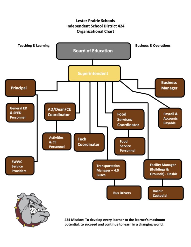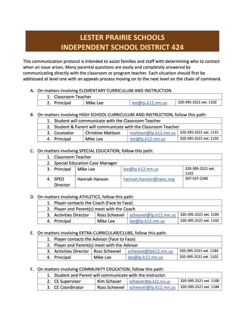 Determining who to contact in a school system may sometimes be a bit problematic. To clarify the communication protocol at the Lester Prairie School District, we created this “Chain of Command,” to help determine where to begin the communication sequence regarding a situation or issue that might arise.